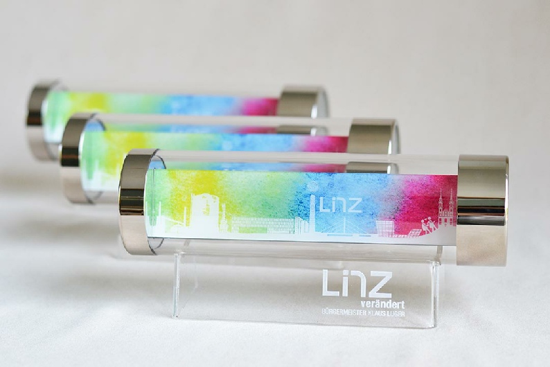 Messing, verchromt und Acrylglas - befüllt mit Fundstücken aus der Stadt Linz